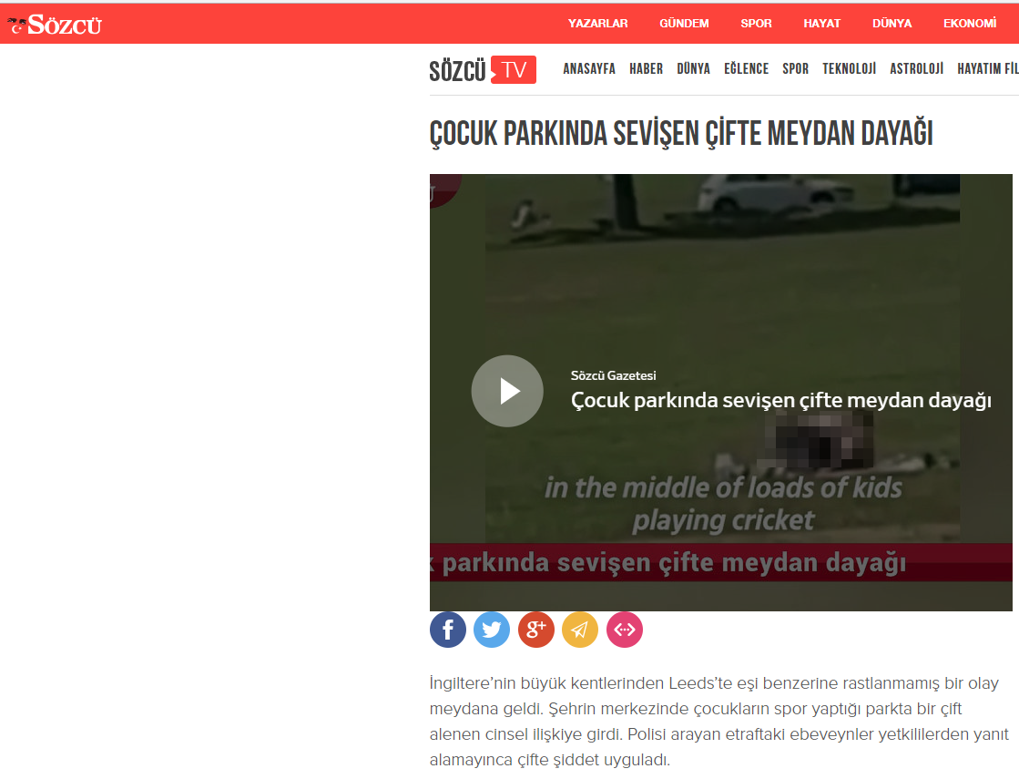 İngiltere’deki bu ahlaksızlığı haberleştiren sözde gazete Sözcü, sapık zihniyetin ağzından konuştu. “Çocuk parkında sevişen çifte meydan dayağı” başlığıyla haberi yayımlayan Sözcü, videonun altında, “İngiltere’nin büyük kentlerinden Leeds’te eşi benzerine rastlanmamış bir olay meydana geldi. Şehrin merkezinde çocukların spor yaptığı parkta bir çift alenen cinsel ilişkiye girdi. Polisi arayan etraftaki ebeveynler yetkililerden yanıt alamayınca çifte şiddet uyguladı.” ifadelerini paylaştı.