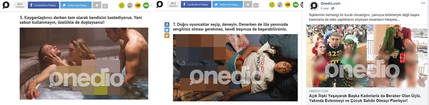 Çıplak fotoğraflar, cinsel ilişki görüntüleri, eşcinsel sapkınlık gibi ahlak dışı haber, paylaşım ve yorumlar, genellikle yabancı sitelerden uyarlama olarak Onedio sitesinde binlerce başlık altında yayınlanıyor. Neredeyse iki haberinden birisi “Porno” veya “Seks” içerikli olan Onedio, Müslüman Anadolu’ya ahlaksızlık pompalıyor.