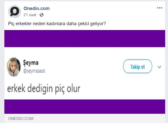 Onedio kimi zaman, “Piç erkekler neden kadınlara daha çekici geliyor” başlıklı haber yayınlıyor, kimi zaman ise “Her boku bildiğini zanneden insanlar”, “Gökyüzünden başımıza düşen koca götlü filler” gibi küfürlü sözlerle oluşturduğu içeriklerini sansürsüzce yayınlıyor.