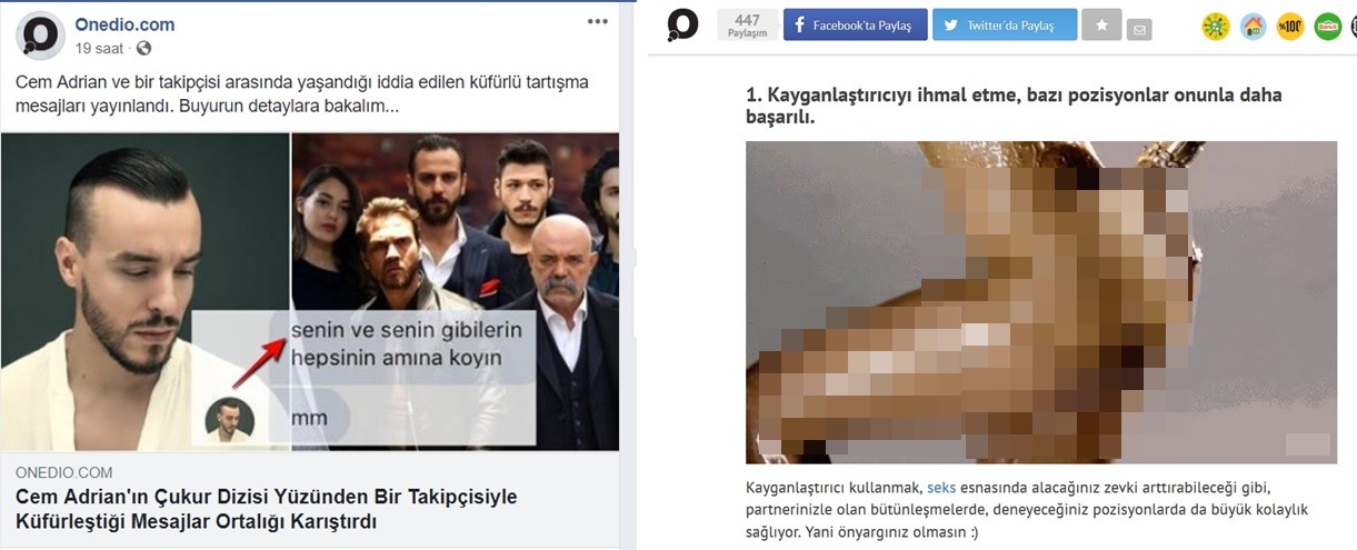 Onedio’nun “İçi fesat olanlar için internetin derinliklerinden çıkarılmış 19 talihsiz fotoğraf” içeriğinde kadın ve erkek cinsel organlarına benzetilen fotoğraflara yer veriliyor. Aynı sitedeki “Porno Sektöründe Kadının Rolü ve Alternatif Olarak Feminist Porno” başlıklı haberin içerisinde bir porno filminin fragmanına yer veriliyor. Onedio’nun Twitter hesabında “soru” olarak “Hem seks esnasında hem toplu taşımada söylenecek söz nedir?” ifadeleri yöneltiliyor.