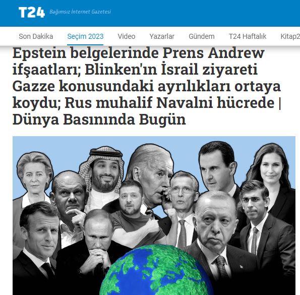 "Epstein belgelerinde Prens Andrew ifşaatları; Blinken'ın İsrail ziyareti Gazze konusundaki ayrılıkları ortaya koydu; Rus muhalif Navalni hücrede, Dünya Basınında Bugün" başlığıyla servis edilen fotoğraf görselinde Prens Andrew'in fotoğrafı bulunmazken Cumhurbaşkanı Recep Tayyip Erdoğan en öne kondu.