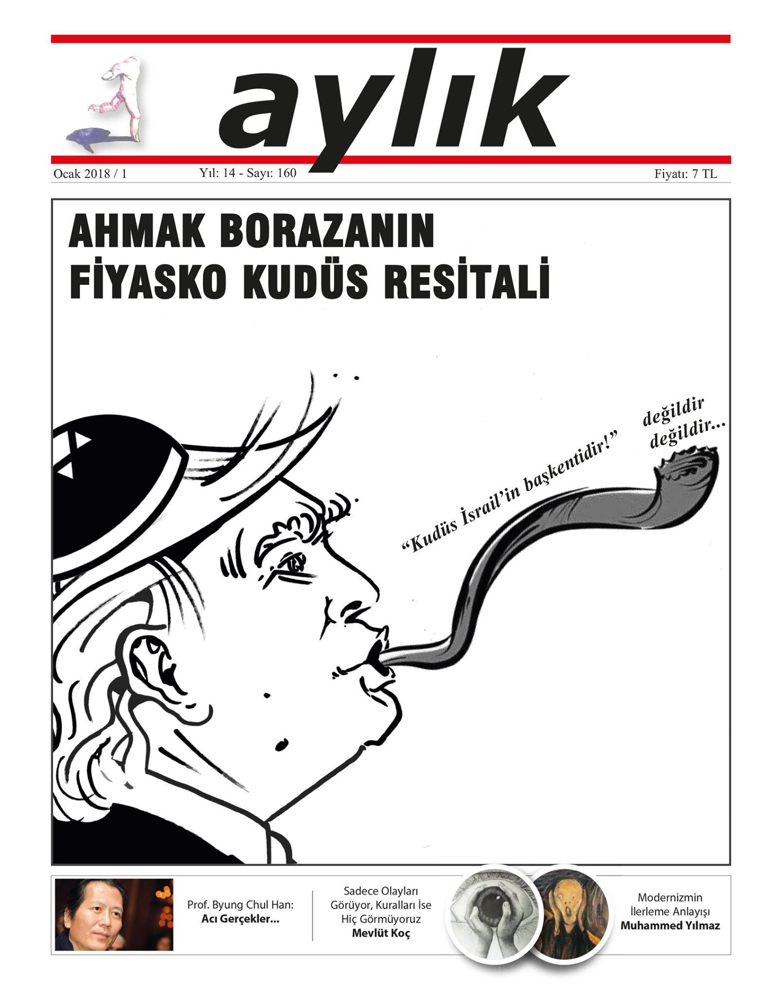 Aylık, 2018’in ilk sayısında ABD başkanı Trump’ın Kudüs’ü İsrail’in “başkent”i olarak kabul ettiğini simgeleyen imzasıyla birlikte dünya çapında tepki uyandıran gelişmeyi kapaktan veriyor.