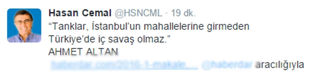 Altan yazısında, "Çok bilinen bir deyiş vardır gazeteciler arasında, “İstanbul’a kar yağmadan Türkiye’ye kış gelmez” derler… Ülkenin dört bir yanında yollar kardan kapansa da İstanbul medyasının ülkede kış olduğunu anlaması için karın kendi şehrine yağdığını görmesi gerekir. O deyişe galiba bir yenisini ekleyeceğiz. Tanklar İstanbul’un mahallelerine girmeden Türkiye’de iç savaş olmaz.” dedi.