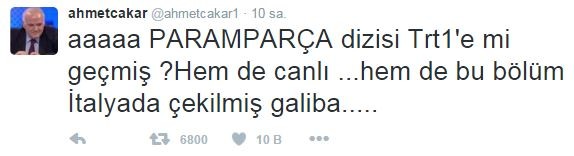 Karşılaşmanın sona ermesinin ardından sosyal medya hesabından bir tweet atan Çakar, "Aaaaa PARAMPARÇA dizisi Trt1'e mi geçmiş ? Hem de canlı... Hem de bu bölüm İtalya'da çekilmiş galiba" dedi.