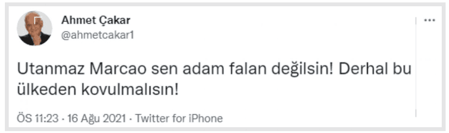 Sosyal medya hesabından, "Utanmaz Marcao sen adam falan değilsin! Derhal bu ülkeden kovulmalısın!" diyen Çakar, yorumculuk yaptığı televizyon programında da “Marcao adam falan değil; Allah, Marcao’nun belasını versin” ifadelerini kullandı.