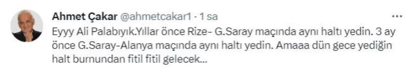 Ayrıca Çakar, "Eyyy Ali Palabıyık. Yıllar önce Rize- Galatasaray maçında aynı haltı yedin. 3 ay önce Galatasaray - Alanya maçında aynı haltı yedin. Ama dün gece yediğin halt burnundan fitil fitil gelecek…" dedi.