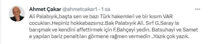 Çakar, maçın hakemi Ali Palabıyık'la ilgili paylaşımda bulunurken, "Ali Palabıyık, başta sen ve bazı Türk hakemleri ve bir kısım VAR çocukları. Hepiniz hokkabazsınız. Bak Palabıyık Ali. Sırf Galatasaray'la barışmak ve kendini affettirmek için Fenerbahçe'yi yedin. Batshuayi ve Samet'e yapılan bariz penaltıları görmene rağmen vermedin ..Yazık çok yazık." ifadelerini kullandı.