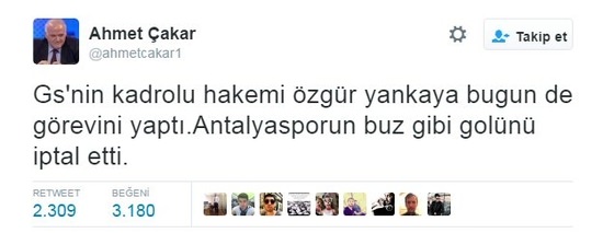 Ahmet Çakar, "Galatasaray'ın kadrolu hakemi Özgür Yankaya, bugün de görevini yaptı. Antalyaspor'un buz gibi golünü iptal etti" diye yazdı.