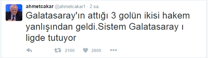 Spor yorumcusu Ahmet Çakar, Galatasaray-Sivasspor karşılaşması sonrası attığı tweet ile Galatasaraylıların büyük tepkisini çekti.