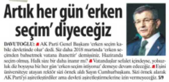 Davutoğlu, “AK Parti Genel Başkanı, ‘erken seçim kabile devletinde olur’ dedi. Siz daha 2018’de erken seçimden bahsetmek vatana ihanettir demişsiniz. Haziran’da seçim olmuş. Halk size bir daha inanır mı?” dedi. Aynı zamanda Davutoğlu, “Vatandaşlar sefalet içindeyse, yolsuzluk diz boyuysa, biz her gün erken seöin istiyoruz demeye devam edeceğiz.” diye konuştu.