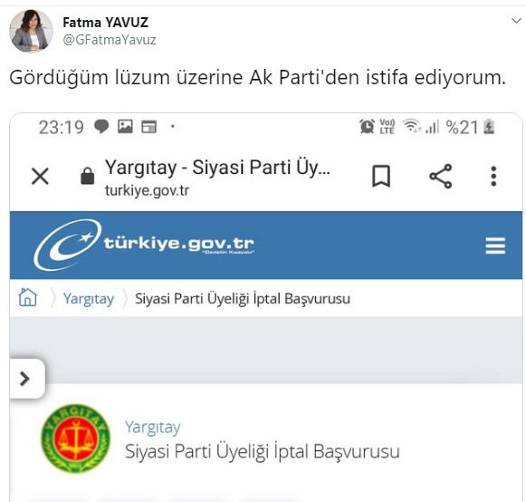 Kişisel Twitter hesabından Yargıtay üzerinden yaptığı parti üyeliğinin iptaline dair görseli paylaşan Yavuz, “Gördüğüm lüzum üzerine Ak Parti'den istifa ediyorum” diye yazdı.