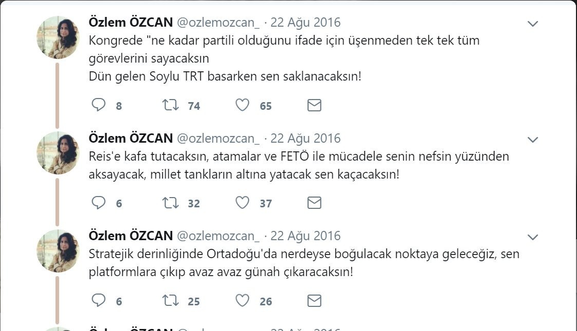 Parti kurma heveslisi eski Başbakan Ahmet Davutoğlu ile hareket etmek için AK Parti'den istifa eden Özlem Özcan'ın üç sene önce yaptığı paylaşımlar ortaya çıktı. Özcan, paylaşımlarında, FETÖ ile mücadele ve Ortadoğu hamleleri nedeniyle Davutoğlu'nu yerden yere vuruyor.