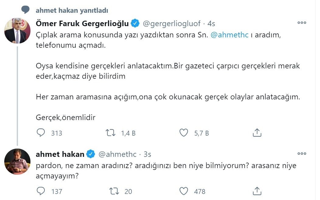 Gergerlioğlu'nun söz konusu paylaşımına gazeteci Ahmet Hakan'dan cevap geldi. Hakan yaptığı açıklamada, "Pardon ne zaman aradınız? Aradığınızı ben niye bilmiyorum? Arasanız niye açmayayım?" dedi.