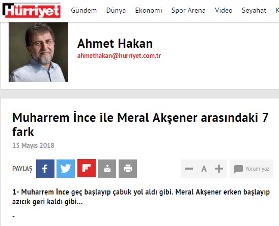 13 Mayıs’taki yazısında ise Ahmet Hakan, Meral Akşener’in erken başlayıp geri kaldığını, Muharrem İnce'nin ise geç başlayıp çabuk yol aldığını savundu.