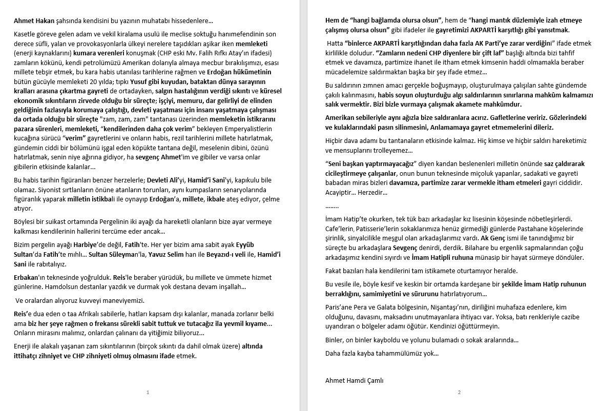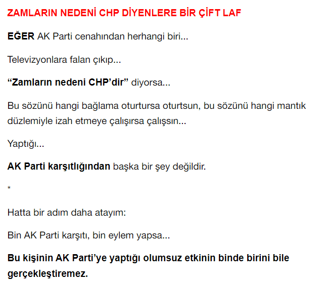 Ve oralardan alıyoruz kuvveyi maneviyemizi. Reis'e dua eden o taa Afrikalı sabilerle, hatları kapsam dışı kalanlar, manada zorlanır belki ama biz her şeye rağmen o frekansı sürekli sabit tuttuk ve tutacağız ila yevmil kıyame... Onların mirasını malımız, onlardan çalınanı da yitiğimiz biliyoruz... Enerji ile alakalı yaşanan zam sıkıntılarının (birçok sıkıntı da dahil olmak üzere) altında ittihatçı zihniyet ve CHP zihniyeti olmuş olmasını ifade etmek, hem de "hangi bağlamda olursa olsun", hem de "hangi mantık düzlemiyle izah etmeye çalışmış olursa olsun" gibi ifadeler ile gayretimizi AK Parti karşıtlığı gibi yansıtmak. Hatta "binlerce AK Parti karşıtlığından daha fazla AK Parti'ye zarar verdiğini" ifade etmek. kirlilikle doludur. "Zamların nedeni CHP diyenlere bir çift laf" başlığı altında bizi tahfif etmek ve davamıza, partimize ihanet ile itham etmek kimsenin haddi olmamakla beraber mücadelemize saldırmaktan başka bir şey ifade etmez...