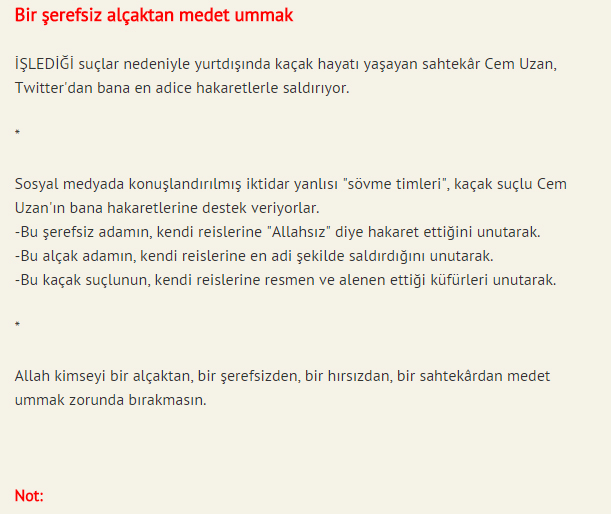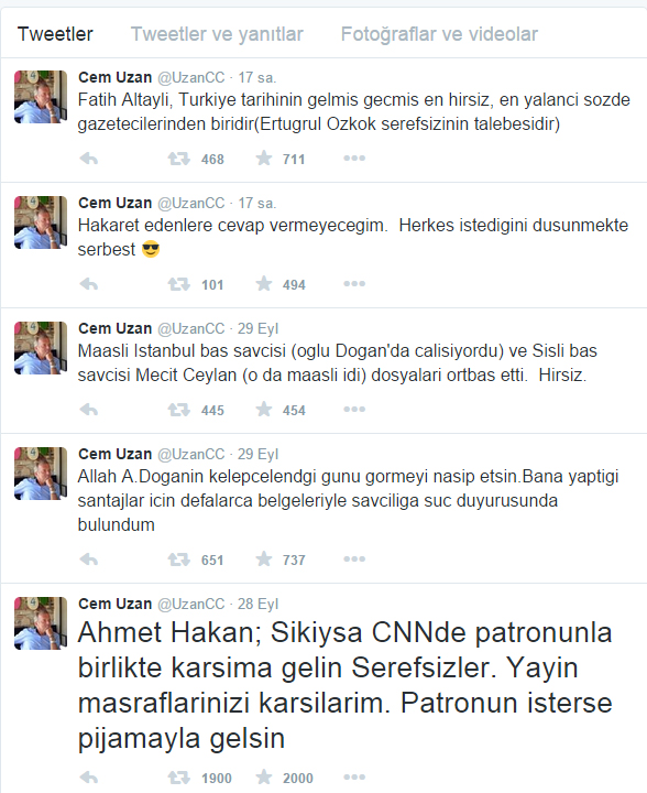 Cem Uzan kaçarak gittiği yurt dışında son günlerde PKK ve DHKP-C’ye verdiği destekle tepki toplayan Aydın Doğan hakkında peş peşe twittler atmıştı. Daha önce Aydın Doğan’ın kendisini tehdit ettiğini söyleyen Cem Uzan, Aydın Doğan’ın kaçakçı ve rüşvetçi olduğunu söyleyerek şerefsiz diyerek hakaret etmişti. Durumdan vazife çıkaran Ahmet Hakan, Hürriyet Gazetesi’ndeki köşesinden Cem Uzan’a hakaret etmişti.