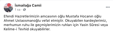 Nakşibendi Şeyhlerinden İsmailağa lideri Mahmut Efendi Hazretlerin amcasının oğlu Mustafa Hocanın oğlu Ahmet Ustaosmanoğlu vefat ettiği öğrenildi.
