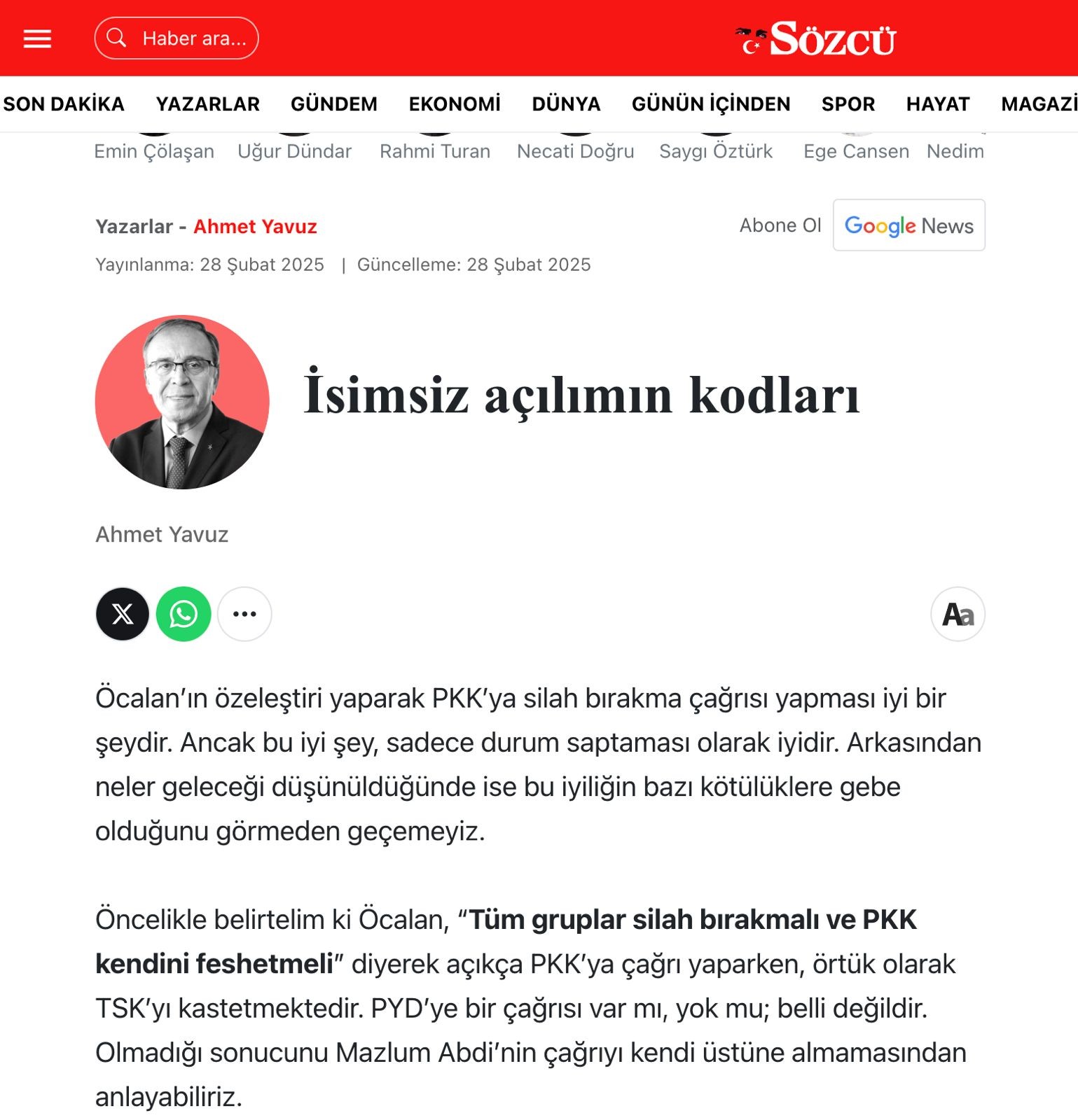 Emekli General Ahmet Yavuz, Sözcü Gazetesi'nde yayımladığı bir yazısında tepkileri üzerine çekti. Yavuz, Abdullah Öcalan’ın PKK’ya silah bırakma çağrısının, aslında “örtük olarak Türk Silahlı Kuvvetleri’ne” yapıldığını iddia ederek 'küstahça' bir açıklamada bulundu.. Yavuz’un bu açıklaması, sadece büyük bir yanlış anlamayı değil, aynı zamanda küstah bir tavrı da gözler önüne serdi.