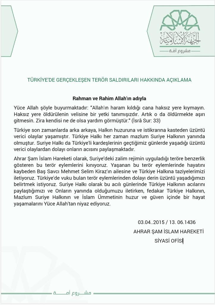 Ahrar'uş Şam İslam Hareketi olarak, Suriye'deki zalim rejimin uyguladığı teröre benzerlik gösteren bu terör eylemlerini kınıyoruz. Yaşanan bu terör eylemlerinde hayatını kaybeden Savcı Mehmet Selim Kiraz'ın ailesine ve Türkiye halkına taziyelerimizi iletiyoruz. Türkiye'de vuku bulan terör eylemlerinden dolayı derin üzüntü yaşadığımızı belirtmek istiyoruz. Suriye halkı olarak bu acılı günlerinde Türkiye halkının acılarını paylaştığımızı ve onların yanında olduğumuzu iletirken, fedakar Türkiye halkının, mazlum Suriye halkının ve İslam Ümmetinin huzur ve güven içinde bir hayat yaşamalarını Yüce Allah'tan niyaz ediyoruz.