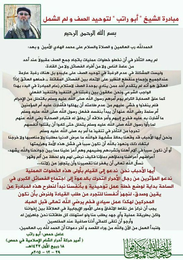 Ahraru Şam Humus Lideri Ebu Ratib'in vefat etmeden önce yayınladığı birlik bildirisi;