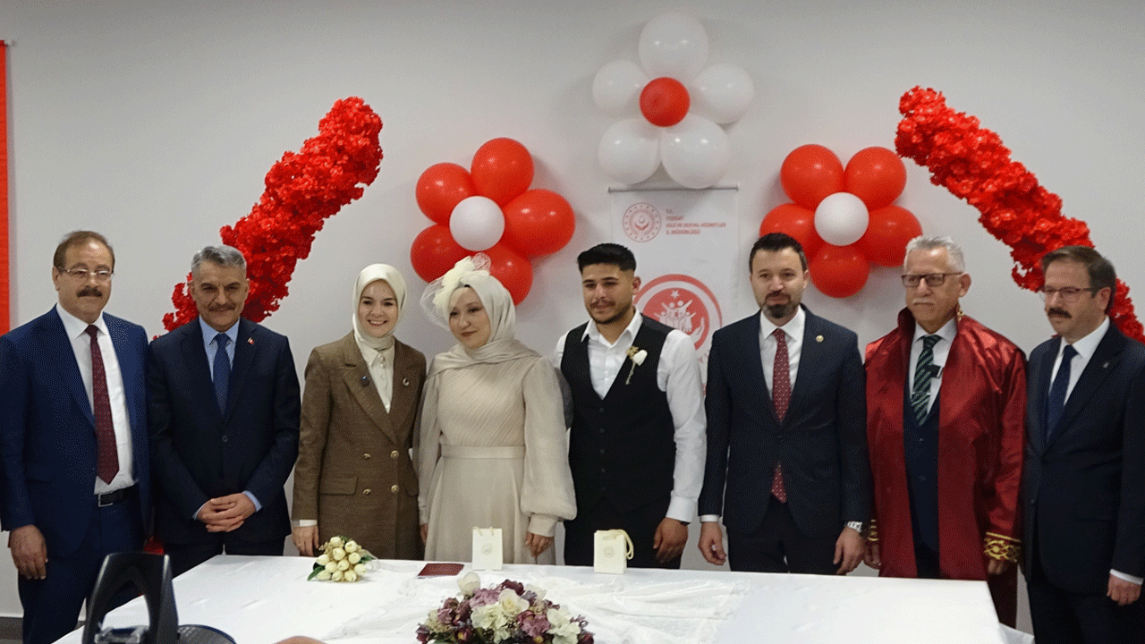 Çifte mutluluklar dileyen Göktaş, "Cumhurbaşkanımızın öncülüğünde Aile Yılı'nda bizler de gençlerimizi destekleme projesini hayata geçirdik. 81 ilimizdeki gençlerimiz bu krediden faydalanabiliyor. Bu programla gençlerimize hem evlenmeden önce hem de evlendikten sonra destek olmak istiyoruz." diye konuştu. Göktaş, nikah töreninin ardından evlilik cüzdanını geline takdim etti.