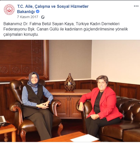 Aile Bakanlığı’nın resmî Twitter ve Facebook hesaplarında 7 Kasım 2017’de ziyarete ilişkin yapılan paylaşımlarda, “Bakanımız Dr. Fatma Betül Sayan Kaya, Türkiye Kadın Dernekleri Federasyonu Bşk. Canan Güllü ile kadınların güçlendirilmesine yönelik çalışmaları konuştu” ifadelerine yer verildiği öğrenildi. Paylaşımda, dönemin Bakanı Fatma Kaya ile Canan Güllü’nün bir aradaki fotoğrafına yer verildiği görüldü.