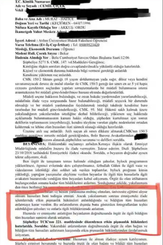 Son olarak ortaya çıkan resmi belgelerde, Cemil Çiçek’in itirafçı konumunda olduğu ve süreçte güvenlik birimleriyle iş birliği yaptığı da yer alıyor.