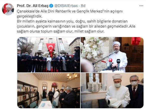 Erbaş yaptığı sosyal medya paylaşımında, “Çanakkale’de Aile Dini Rehberlik ve Gençlik Merkezi’nin açılışını gerçekleştirdik. Bir milletin ayakta kalmasının yolu, doğru, sahih bilgilerle donatılan çocukların, gençlerin varlığından ve sağlam bir aileden geçmektedir. Aile sağlam olursa toplum sağlam olur, millet sağlam olur” ifadelerini kullandı.