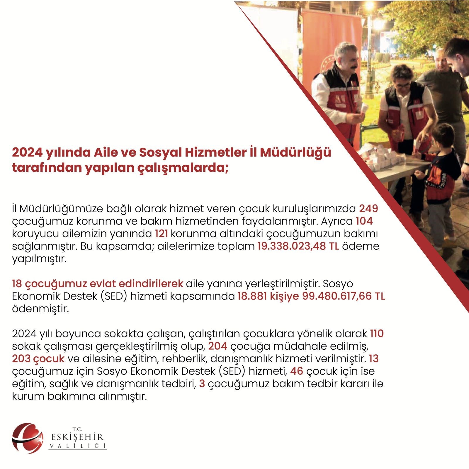 Aile ve Sosyal Hizmetler Eskişehir İl Müdürlüğü'nce 18 çocuk evlat edindirilerek aile yanına yerleştirildi. Sosyo Ekonomik Destek (SED) hizmeti çerçevesinde, 18 bin 881 kişiye 99 milyon 480 bin 617 TL ödendi. 2024 yılı boyunca sokakta çalışan ve çalıştırılan çocuklara yönelik olarak 110 sokak çalışması gerçekleştirilirken, 204 çocuğa müdahale edildi. 203 çocuk ile ailesine eğitim, rehberlik ve danışmanlık hizmeti verildi. 13 çocuk için Sosyo Ekonomik Destek (SED) hizmeti sağlandı. 46 çocuk için eğitim, sağlık ile danışmanlık tedbiri alınırken, 3 çocuk ise bakım tedbir kararı ile kurum bakımına alındı.