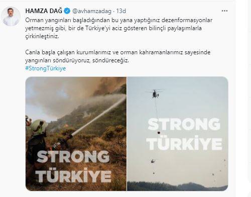 AK Parti Genel Başkan Yardımcısı Tanıtım ve Medya Başkanı İzmir Milletvekili Hamza Dağ, orman yangınlarıyla ilgili sosyal medyada yapılan paylaşımlara ilişkin açıklamada bulundu. Hamza Dağ, hesabından yaptığı açıklamada, Orman yangınları başladığından bu yana yaptığınız dezenformasyonlar yetmezmiş gibi, bir de Türkiye’yi aciz gösteren bilinçli paylaşımlarla çirkinleştiniz. Canla başla çalışan kurumlarımız ve orman kahramanlarımız sayesinde yangınları söndürüyoruz, söndüreceğiz” şeklinde konuştu.