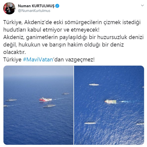 Tansiyonun yükseldiği, dünyanın gözünü çevirdiği Doğu Akdeniz'e ilişkin Twitter hesabından açıklamada bulunan AK Parti Genel Başkanvekili Numan Kurtulmuş, Akdeniz'de eski sömürgecilerin çizmek istediği hudutların kabul edilmeyeceğini belirtti.