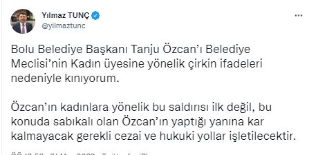 AK Parti Grup Başkanvekili ve Bartın Milletvekili Yılmaz Tunç resmi sosyal medya hesabından yaptığı paylaşımda şu ifadelere yer verdi; “Bolu Belediye Başkanı Tanju Özcan’ı Belediye Meclisi’nin Kadın üyesine yönelik çirkin ifadeleri nedeniyle kınıyorum. Özcan’ın kadınlara yönelik bu saldırısı ilk değil, bu konuda sabıkalı olan Özcan’ın yaptığı yanına kar kalmayacak gerekli cezai ve hukuki yollar işletilecektir”