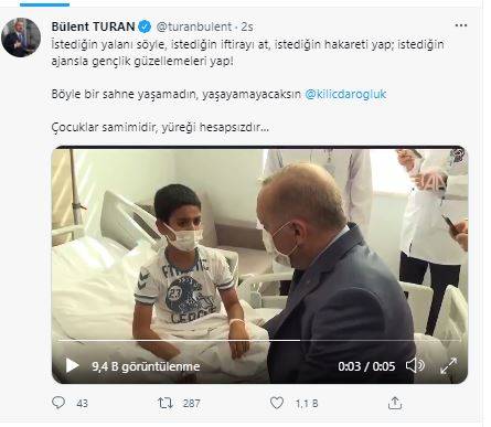 Sosyal medya hesabından paylaşımda bulunan AK Parti Grup Başkanvekili, Çanakkale Milletvekili Bülent Turan, Kemal Kılıçdaroğlu’nu işaret ederek, “İstediğin yalanı söyle, istediğin iftirayı at, istediğin hakareti yap; istediğin ajansla gençlik güzellemeleri yap! Böyle bir sahne yaşamadın, yaşayamayacaksın @kilicdarogluk Çocuklar samimidir, yüreği hesapsızdır” dedi.
