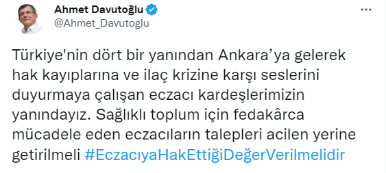 "Türkiye'nin dört bir yanından Ankara’ya gelerek hak kayıplarına ve ilaç krizine karşı seslerini duyurmaya çalışan eczacı kardeşlerimizin yanındayız." diyen Davutoğlu, "Sağlıklı toplum için fedakârca mücadele eden eczacıların talepleri acilen yerine getirilmeli" ifadelerini kullandı.