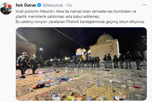 CHP Parti Sözcüsü Tekirdağ Milletvekili Faik Öztrak: “İsrail polisinin Mescid-i Aksa’da namaz kılan cemaate ses bombaları ve plastik mermilerle saldırması asla kabul edilemez. Bu saldırıyı kınıyor; yaralanan Filistinli kardeşlerimize geçmiş olsun diliyoruz.”