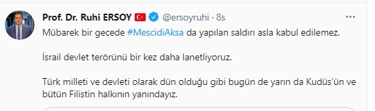 MHP Genel Başkan Başdanışmanı 25-26. dönem MHP Osmaniye Milletvekili Prof. Dr. Ruhi Ersoy:“Mübarek bir gecede #MescidiAksa da yapılan saldırı asla kabul edilemez. İsrail devlet terörünü bir kez daha lanetliyoruz. Türk milleti ve devleti olarak dün olduğu gibi bugün de yarın da Kudüs’ün ve bütün Filistin halkının yanındayız”