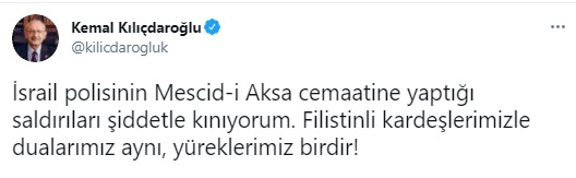 CHP Genel Başkanı Kemal Kılıçdaroğlu: “İsrail polisinin Mescid-i Aksa cemaatine yaptığı saldırıları şiddetle kınıyorum. Filistinli kardeşlerimizle dualarımız aynı, yüreklerimiz birdir!”