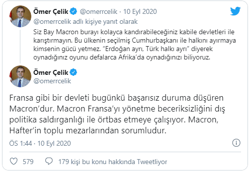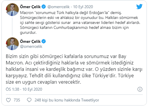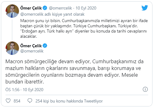 Ömer Çelik, Macron’un sömürgeciliğe devam ettiğini belirterek, ‘’Cumhurbaşkanımız da mazlum halkların çıkarlarını savunmaya, barışı korumaya ve sömürgecilerin oyunlarını bozmaya devam ediyor. Mesele bundan ibarettir" dedi.