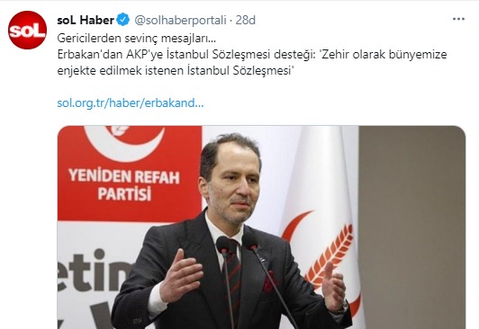 Yeniden Refah Partisi Genel Başkanı Dr. Fatih Erbakan, Cumhurbaşkanı Recep Tayyip Erdoğan’ın imzaladığı kararname ile İstanbul Sözleşmesi’nin kaldırılmasına destek verdi. Erbakan’ın açıklamaları sol cenahı rahatsız ederken, Sol Haber yayınladığı haberle hazımsızlığını gözler önüne serdi.