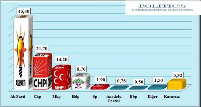 Politiks Araştırma Şirketi tarafından ülke genelinde 2 bin 230 kişiyle yapılan ankette Ak Parti 45,40 oy oranıyla birinci oldu. Yüzde 5’lik bir kayıp yaşayan Cumhuriyet Halk Partisi ise, 21,70 oranla ikinciliğini korudu. Üçüncü de yüzde 14,20 oy oranıyla Milliyetçi Hareket Partisi oldu. Seçime parti olarak girmeyi planlayan HDP’nin oyu ise yüzde 8,7 ile baraja takıldı. SP, 1,90 Anadolu Partisi 0,78 BBP 0,50 Diğer 1,50 kararsız 5,32 oy oranına ulaştı.