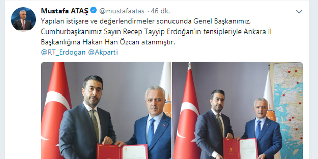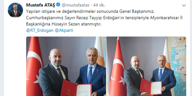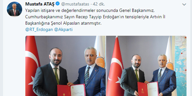 AK Parti Teşkilatlardan Sorumlu Genel Başkan Yardımcısı Mustafa Ataş, Türkiye Cumhurbaşkanı ve AK Parti Genel Başkanı Erdoğan'ın tensipleriyle Ankara, Afyonkarahisar ve Artvin il başkanlıklarına atama yapıldığını aktardı.