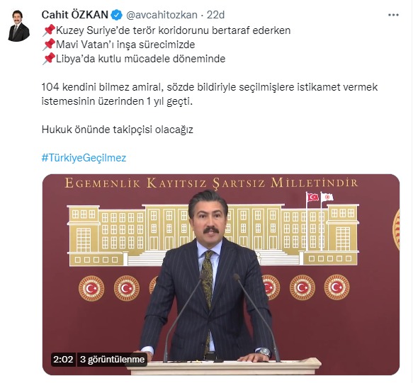AK Parti Grup Başkanvekili ve Denizli Milletvekili Cahit Özkan 104 amiralin hazırladığı Montrö bildirisinin 1’inci yıl dönümüne ilişkin sosyal medya hesabı üzerinden bir paylaşımda bulundu. #TürkiyeGeçilmez başlığı ile paylaşım yapan Özkan, “Kuzey Suriye’de terör koridorunu bertaraf ederken, Mavi Vatan’ı inşa sürecimizde, Libya’da kutlu mücadele döneminde 104 kendini bilmez amiral, sözde bildiriyle seçilmişlere istikamet vermek istemesinin üzerinden 1 yıl geçti. Hukuk önünde takipçisi olacağız” ifadelerini kullandı.
