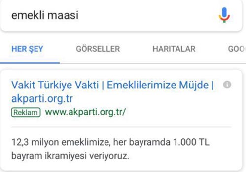Otomobil kredisi arayan kullanıcılara yerli otomobil müjdesi, uçak bileti arayanlara 3. Havalimanı, iş ilanı, işsizlik maaşı ile ilgili arama yapan kullanıcılara “Uzmanlaştırılmış Meslek Edinme Merkezi”, sgk, emekli maaşı gibi aramalarda ise emeklilere verilecek 1.000 TL bayram ikramiyesini duyurdu.