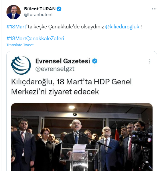 Twitter hesabından Kılıçdaroğlu'na ilişkin haberi alıntılayan Turan, 18 Mart Çanakkale Zaferi'ni hatırlattı.