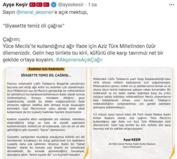 AK Parti Genel Merkez Kadın Kolları Başkanı Ayşe Keşir, İYİ Parti Genel Başkanı Meral Akşener'e "Siyasette Temiz Dil Çağrısı" başlıklı açık mektup yazarak şehit yakınına küfreden İYİ Partili Lütfü Türkkan'la ilgili eleştirilerde bulundu.