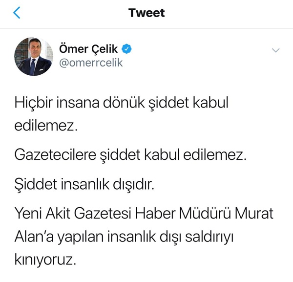 SEZAİ ERHAN - AK Parti Sözcüsü Ömer Çelik, sosyal paylaşım sitesi Twitter hesabından yaptığı açıklamada, “Hiçbir insana dönük şiddet kabul edilemez. Gazetecilere şiddet kabul edilemez.Şiddet insanlık dışıdır. Yeni Akit Gazetesi Haber Müdürü Murat Alan’a yapılan insanlık dışı saldırıyı kınıyoruz” dedi.