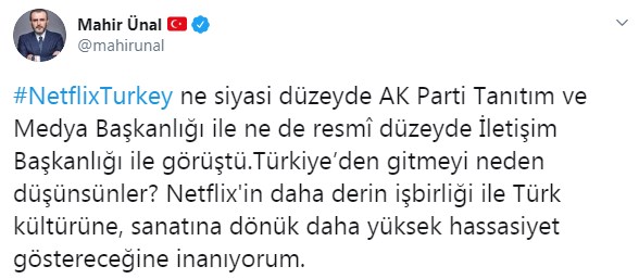 Ünal, yaptığı paylaşımda, "#NetflixTurkey ne siyasi düzeyde AK Parti Tanıtım ve Medya Başkanlığı ile ne de resmî düzeyde İletişim Başkanlığı ile görüştü. Türkiye’den gitmeyi neden düşünsünler? Netflix'in daha derin işbirliği ile Türk kültürüne, sanatına dönük daha yüksek hassasiyet göstereceğine inanıyorum." ifadelerini kullandı.