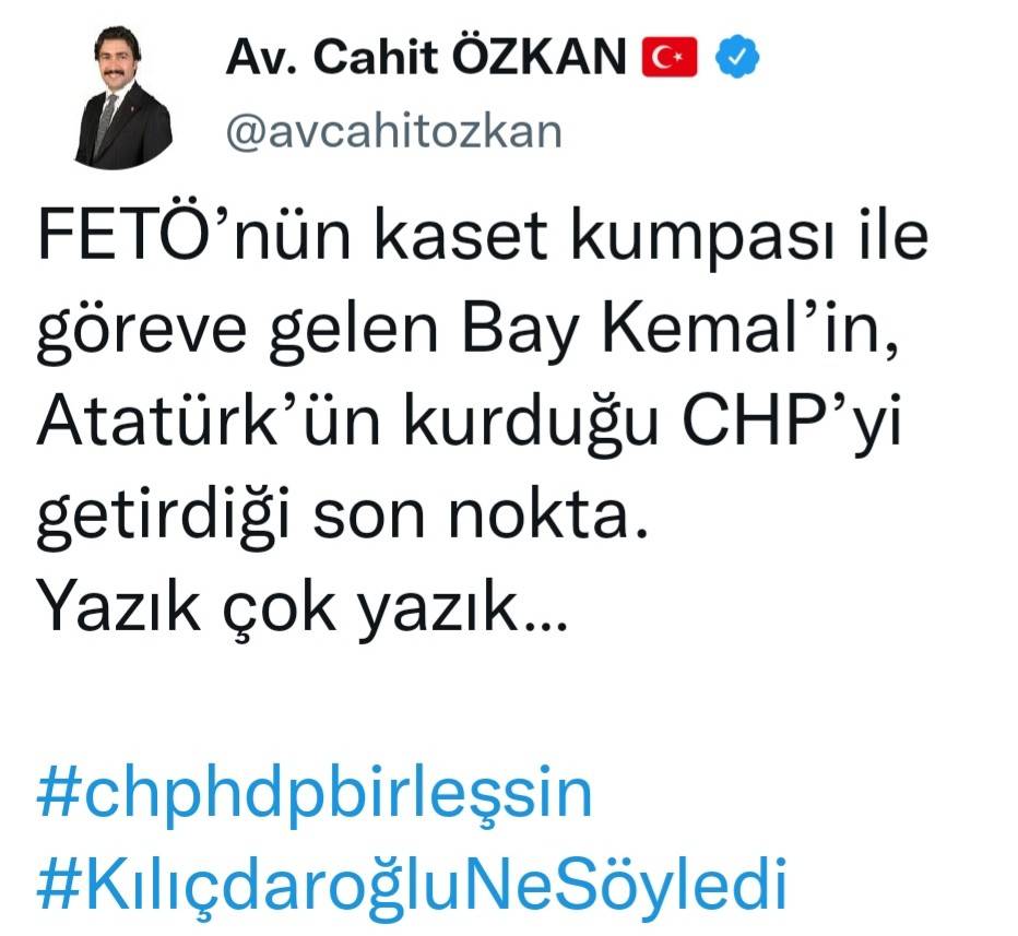 Duruma sosyal medya hesabından tepki gösteren AK Parti Grup Başkanvekili, Denizli Milletvekili Cahit Özkan, “FETÖ’nün kaset kumpası ile göreve gelen Bay Kemal’in, Atatürk’ün kurduğu CHP’yi getirdiği son nokta. Yazık çok yazık” diyerek paylaşımda bulundu.