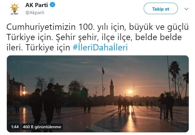 "Cumhuriyetimizin 100. yılı için, büyük ve güçlü Türkiye için. Şehir şehir, ilçe ilçe, belde belde ileri. Türkiye için #İleriDahaİleri" notuyla yayınlanan klipte istikrar vurgusu yapıldı.