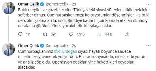 AK Parti Sözcüsü Çelik, sosyal paylaşım sitesi Twitter hesabından yaptığı paylaşımda, “Batılı dergiler ve gazeteler yine Türkiye’deki siyasi süreçleri etkilemek için seferber olmuş. Cumhurbaşkanımıza karşı yorumlar döşenmişler. Halbuki ders almış olmaları lazımdı. Şimdiye kadar hiçbir konuda etkileri olmadığı defalarca görüldü. Yine aynı akıbetle karşılaşacaklar” ifadelerini kullandı.